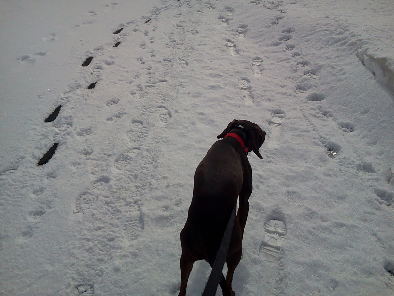 [Dog is German short-hair pointer (definite) / chocolate lab (we think) mix. And yes he is wearing a Gentle Leader walking harness which, by the way, is a miracle straight from the gods.]